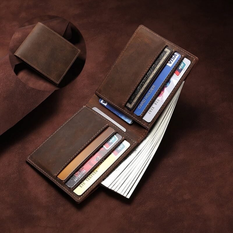 Xeie Thuk Men’s Crazy Horse Leather Tri-Fold Wallet-Dark Brown: Vertical